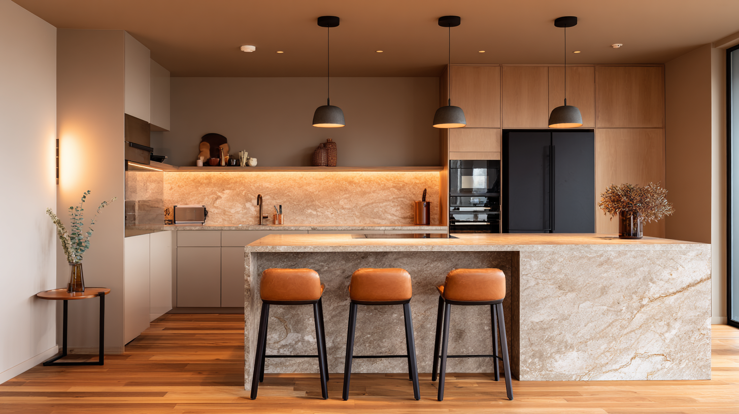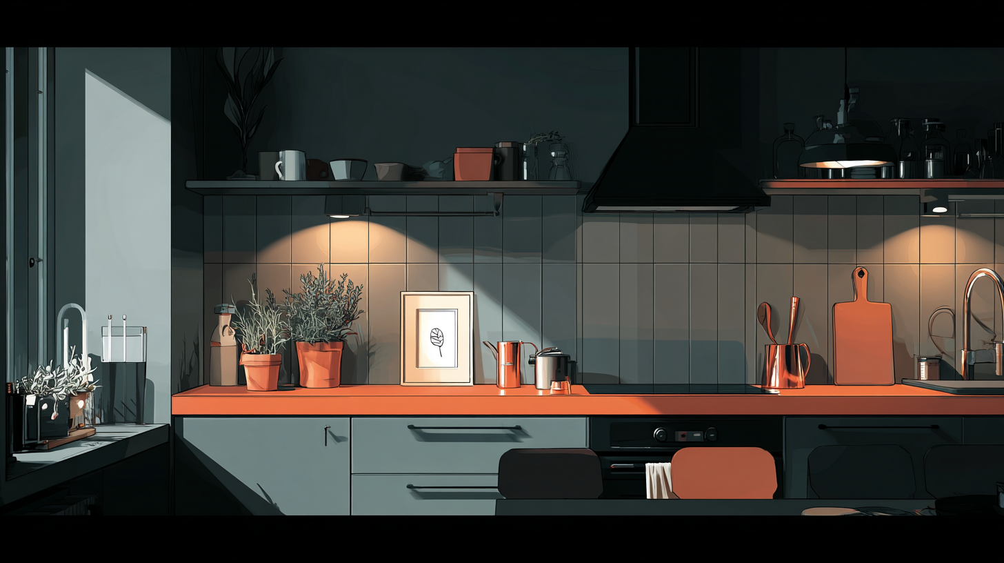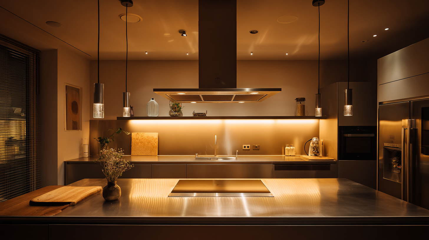 Denken Sie dabei an eine sanft beleuchtete Kochinsel, über der zwei Pendelleuchten aus mundgeblasenem Glas schweben – warmes Licht trifft auf schimmernde Oberflächen, während der Rest des Raumes in eine angenehme Grundhelligkeit getaucht ist.