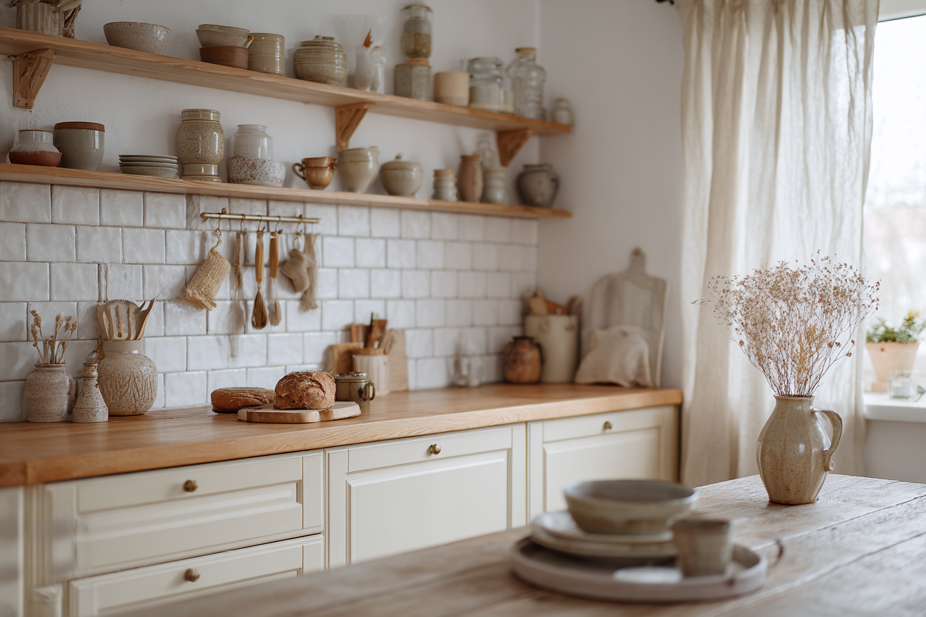 - Akzente: warme Holztöne, gedämpftes Blau, zartes Grün von Kräutern, Messingdetails