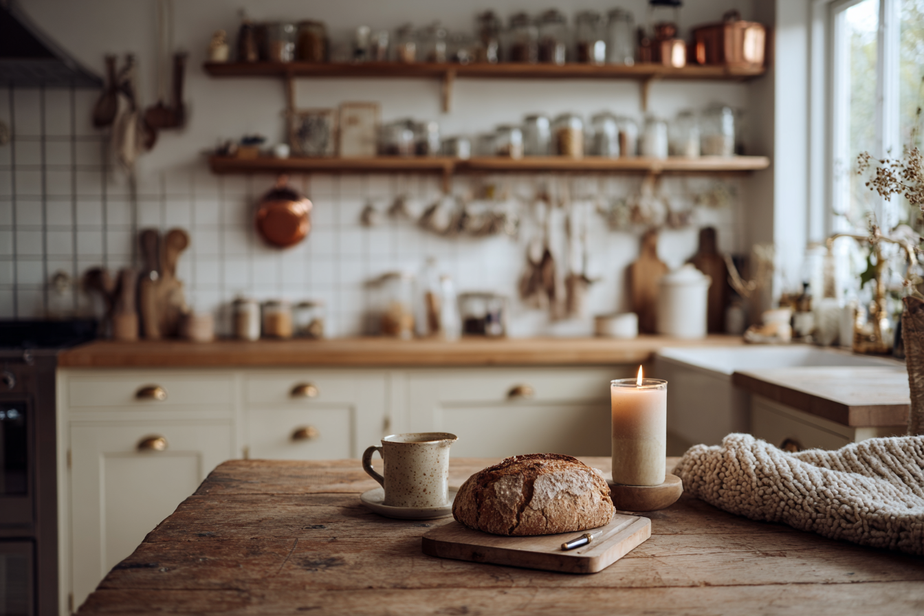 Der Duft von frisch gebackenen Zimtschnecken erfüllt die Luft, warmes Kerzenlicht tanzt über helle Holzoberflächen.