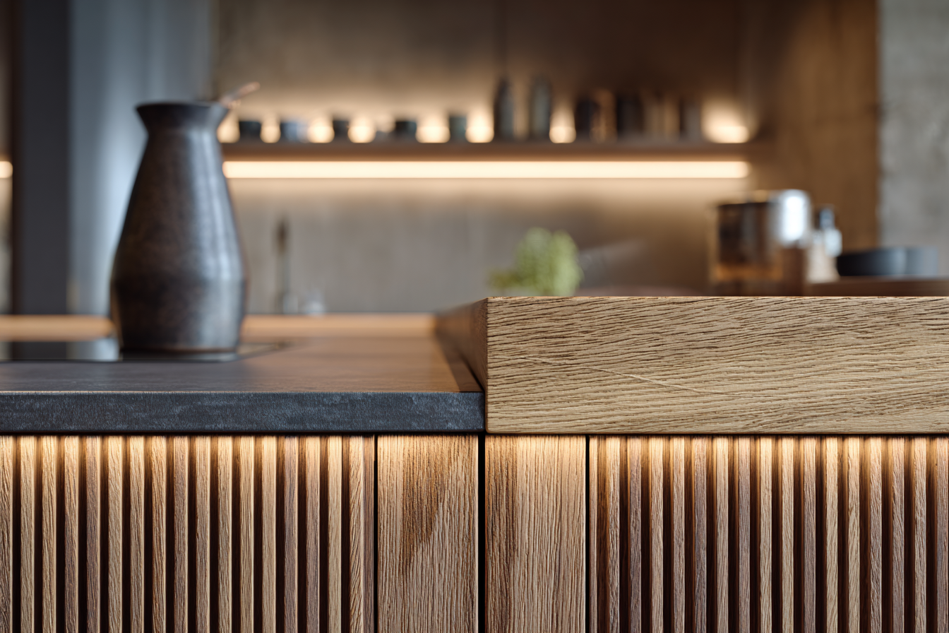 Ein klarer Treiber des Holztrends sind strukturierte Holzfronten. Dabei geht es nicht nur um das Material selbst, sondern um die Art und Weise, wie es verarbeitet wird. Vertikale Rillenfräsungen, horizontale Lamellenoptik oder sanft ausgearbeitete Rahmenprofile verleihen der Küchenfront eine dreidimensionale Wirkung.